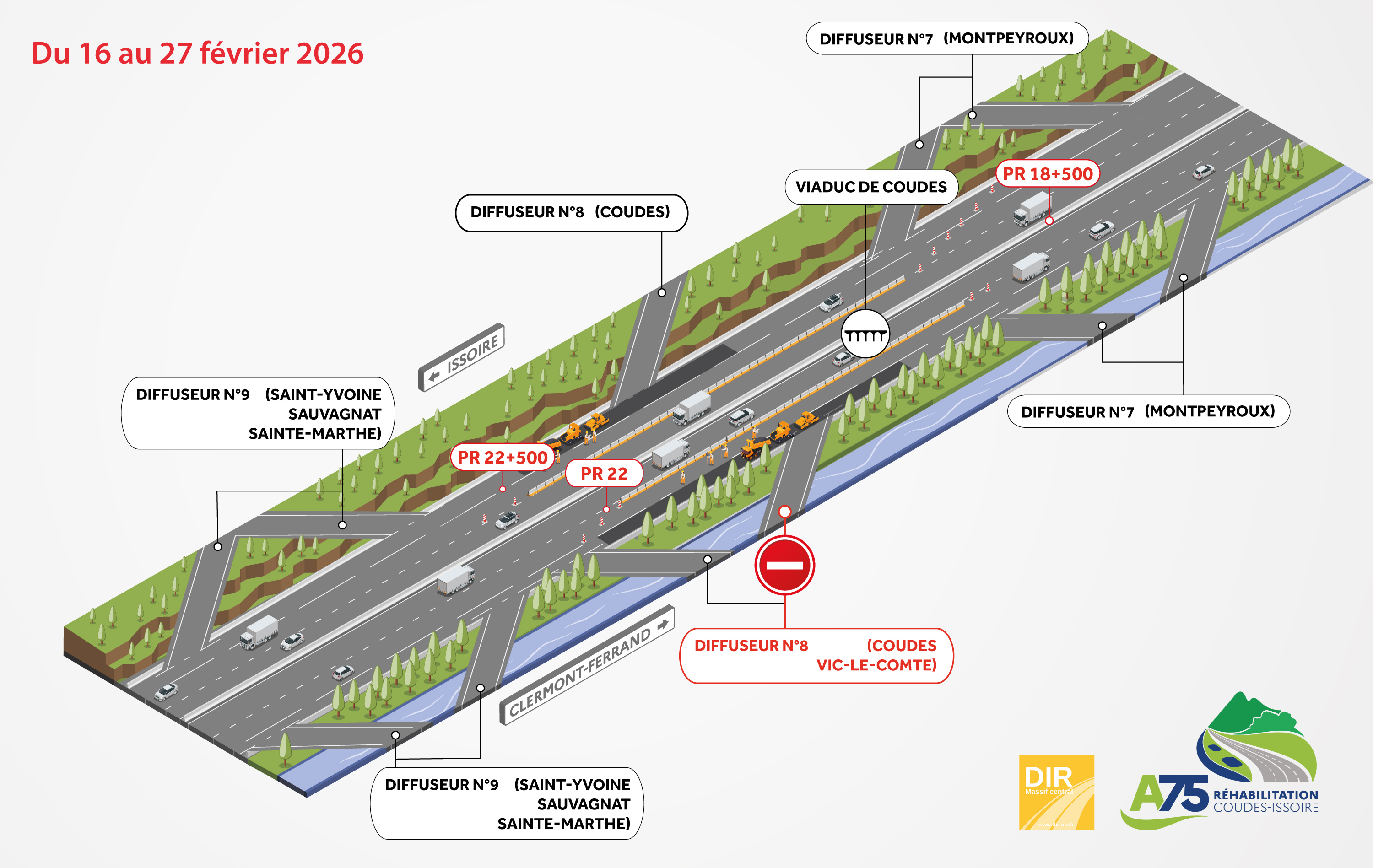 La bretelle d’entrée du diffuseur n°8 "Coudes" sens Sud/Nord (vers Clermont-Ferrand) sera fermée à la circulation ; une déviation sera mise en place par l’A75 depuis le diffuseur n°8 sens Nord/Sud avec demi-tour au diffuseur n°9 "Sauvagnat-Ste-Marthe, Veneix".