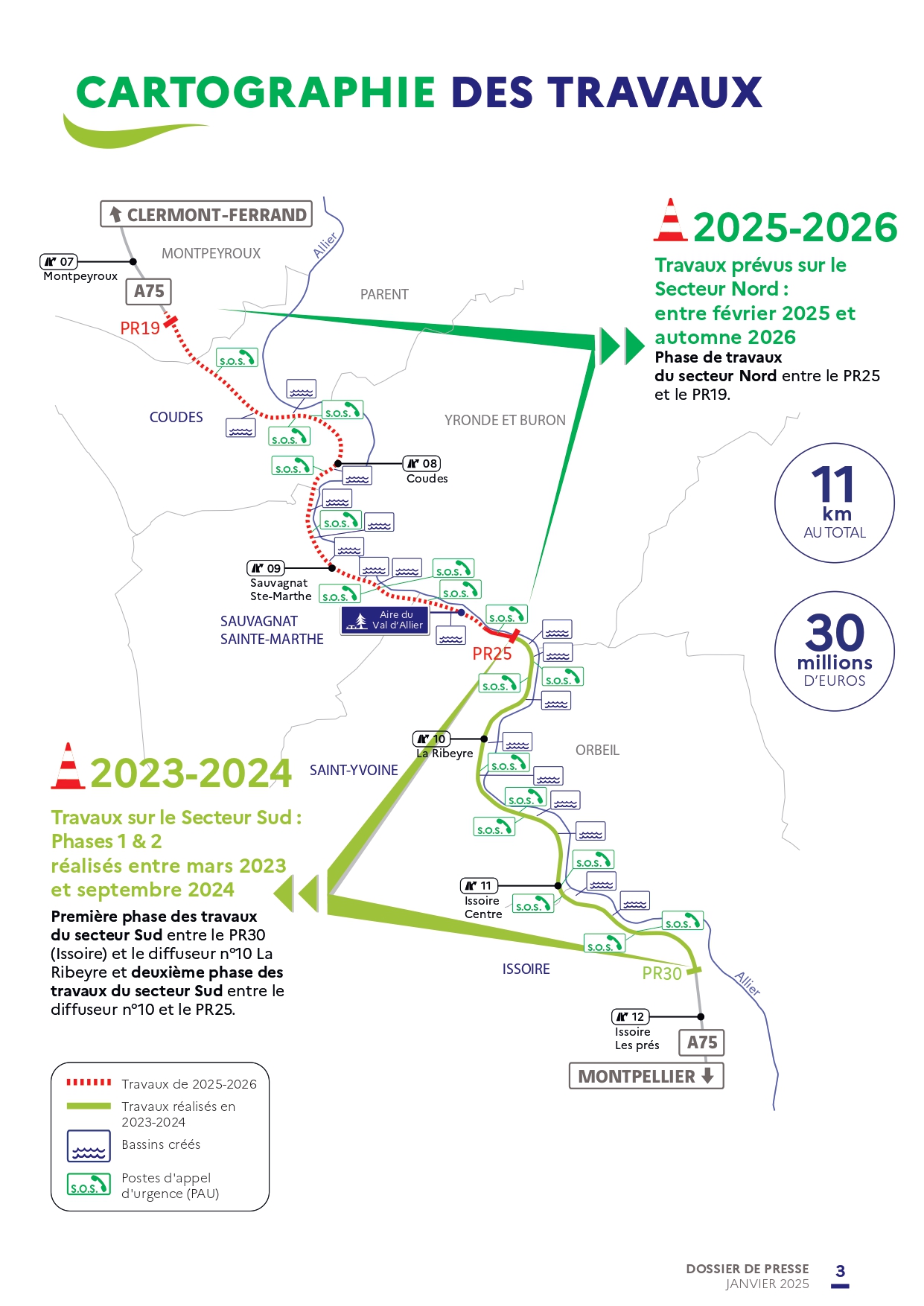 Le premier secteur de travaux concerne 5,1 km au Sud du projet entre le PR30 (Issoire) et le PR25 (St-Yvoine). Le coût de cette première phase est de 14 millions d’euros (12,5 M€ État, 1,5 M€ Département du Puy-de-Dôme).